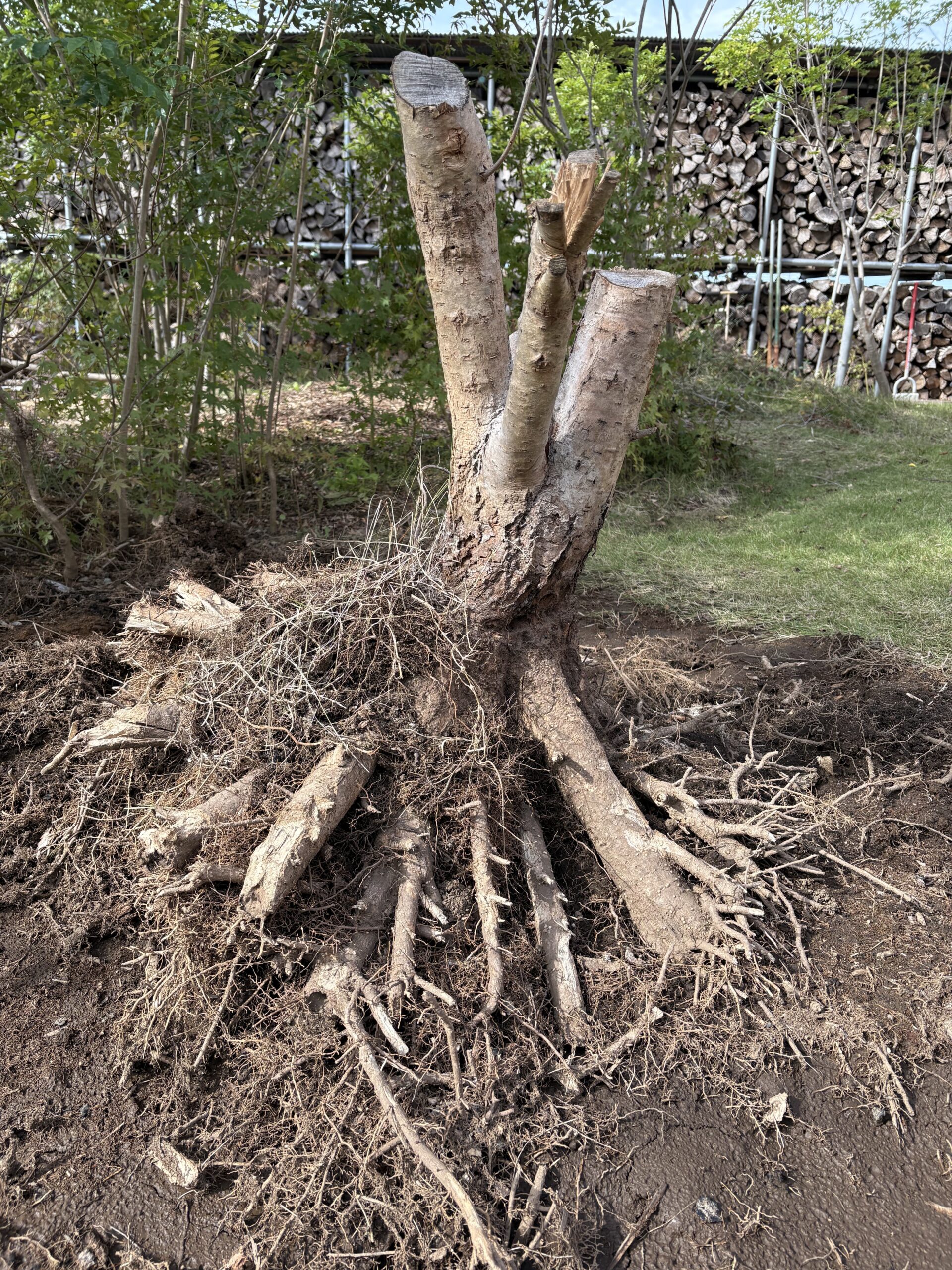 2mヤマボウシは楽勝でしたがくらいの大きさになると細かい根がしぶとい。
